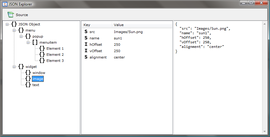 JSON Explorer is a small Windows application which allows you to easily and visually browse JSON structures/strings. Objects and arrays are presented as a tree-like structure, with all their various properties, types and values shown in a “property editor” type view. The source string for each element within the tree structure is also shown, neatly formatted for readability.